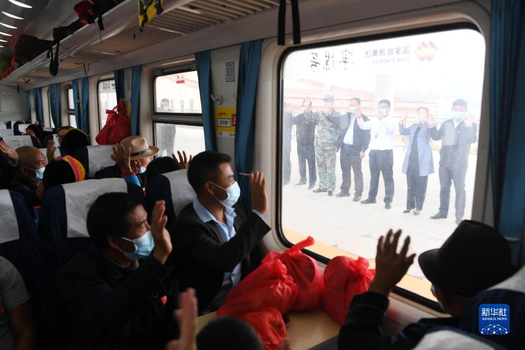 9月24日,在舟曲避險搬遷“感恩號”專列上,避險搬遷居民與家鄉(xiāng)干部群眾告別。新華社記者 范培珅 攝