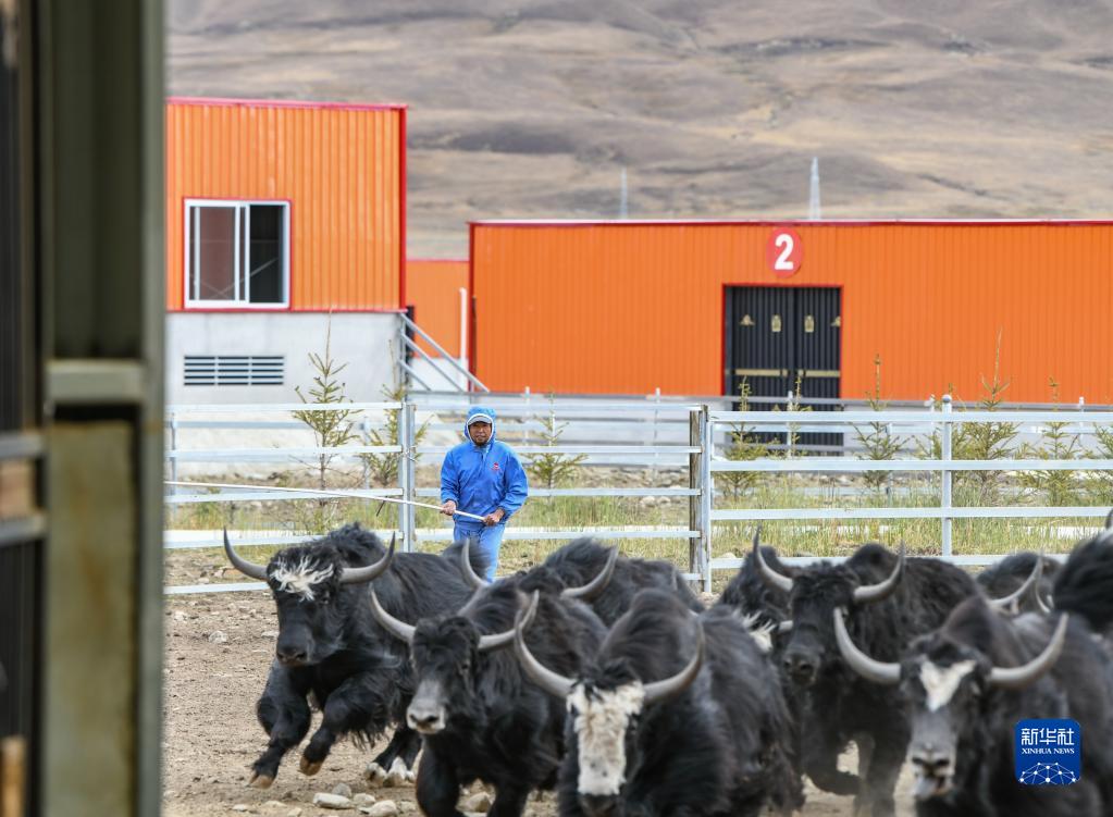 10月20日,在四川省甘孜藏族自治州理塘縣牦牛產業(yè)園區(qū),飼養(yǎng)員將牦牛趕回育肥大棚。新華社記者 王曦 攝