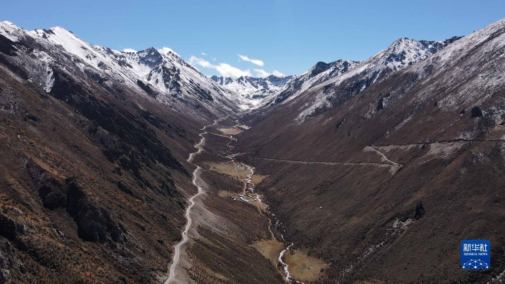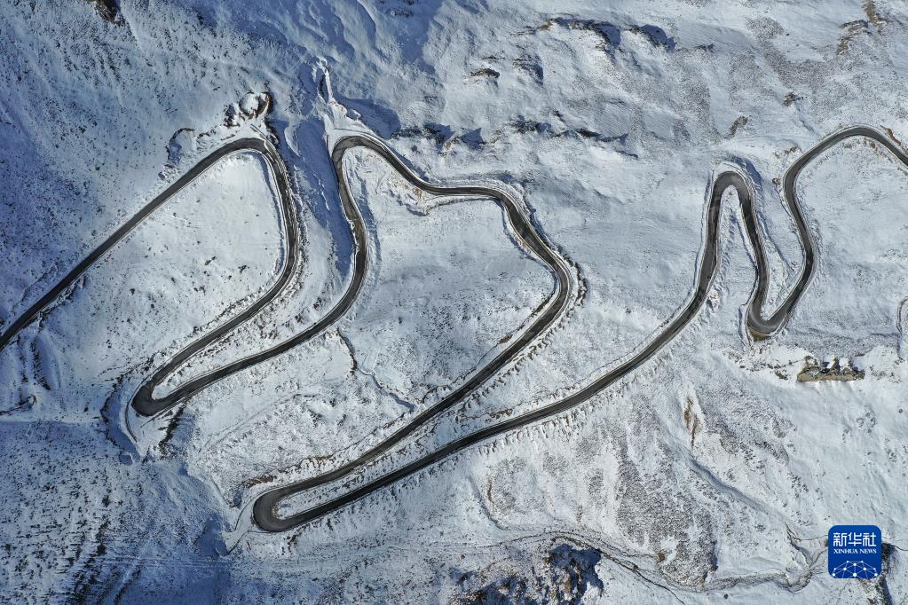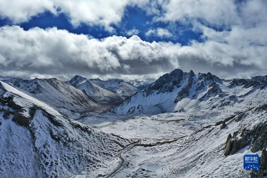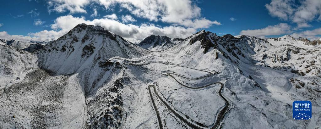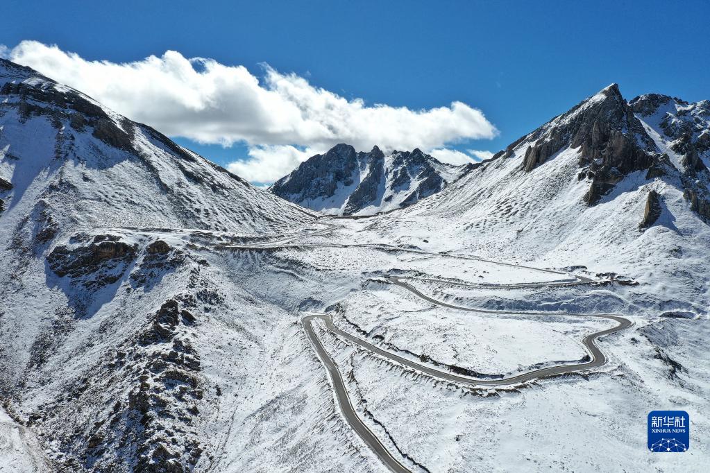 這是四川省甘孜藏族自治州巴塘縣境內(nèi)的通往藏巴拉雪山埡口的公路(10月23日攝,無人機(jī)全景照片)。新華社記者 胥冰潔 攝
