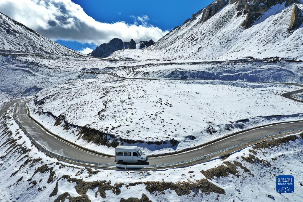 10月23日,一輛汽車行駛在四川省甘孜藏族自治州巴塘縣境內(nèi)的藏巴拉雪山的公路上(無人機(jī)照片)。新華社記者 劉坤 攝