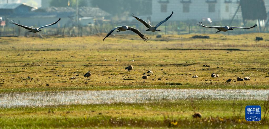 入秋以來,云南省迪慶藏族自治州香格里拉市納帕海國際重要濕地迎來越冬黑頸鶴。首批黑頸鶴抵達以來,已監(jiān)測到200余只。