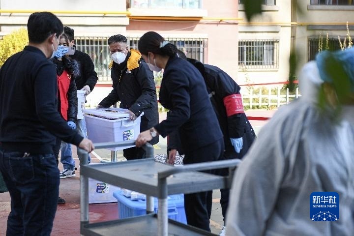 “大家辛苦了,快來拿飯吧,趁熱吃?!薄俺缘暮鹊亩加?,酸奶和牛奶每人一盒?!痹谖鲗幰咔榉揽匾痪€的核酸檢測(cè)點(diǎn),一位皮膚黝黑的藏族漢子和同事抬著箱子,忙前忙后為工作人員和志愿者遞上盒飯??吹酱蠡锒汲陨蠠犸?,臉上露出了爽朗的笑容。