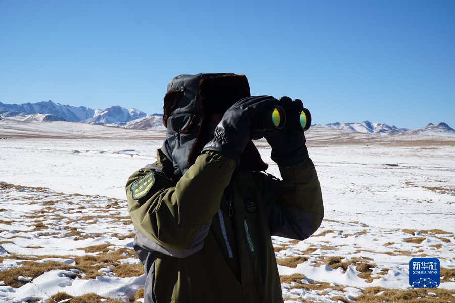 12月3日,祁連山國家公園沙龍灘管護(hù)站生態(tài)管護(hù)員楊有財用望遠(yuǎn)鏡觀測。新華社記者 耿輝凰 攝