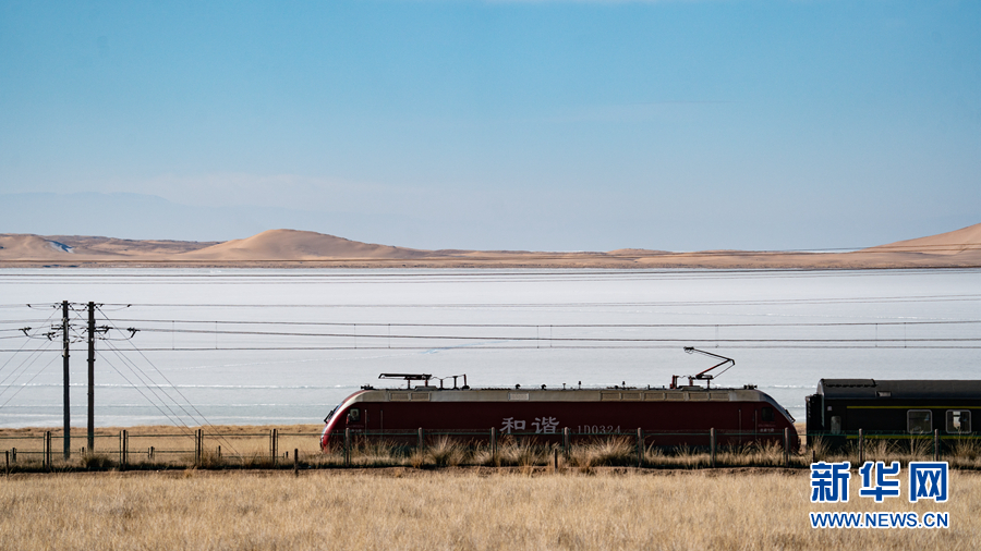 列車從青海湖畔緩緩駛過。新華網(wǎng) 宋忠勇 攝