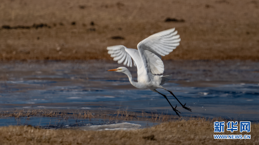 一只白鷺在青海湖畔飛舞。新華網(wǎng) 宋忠勇 攝