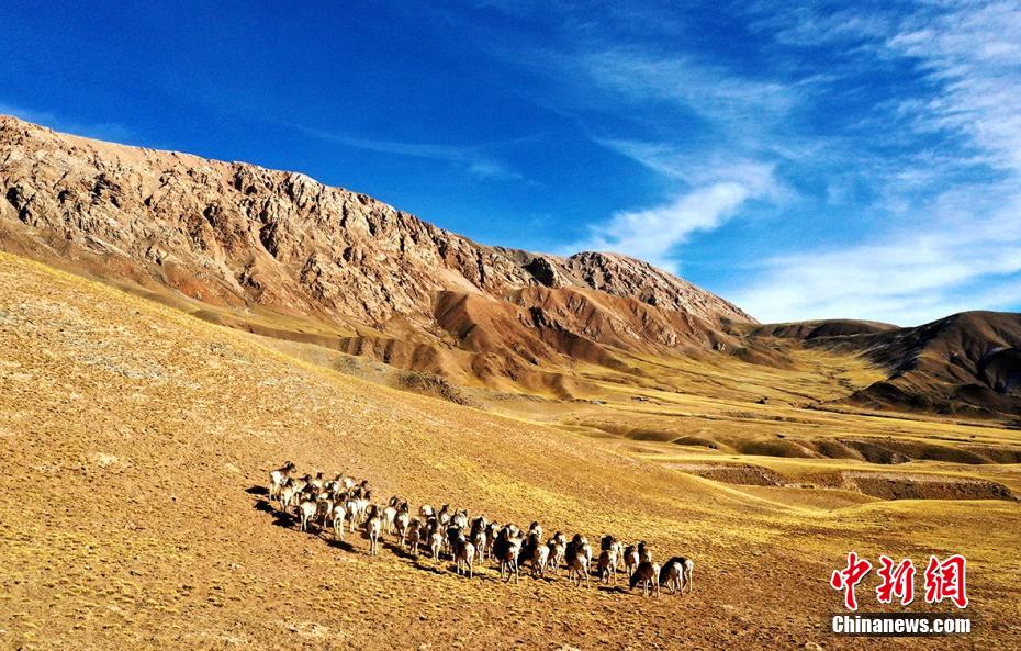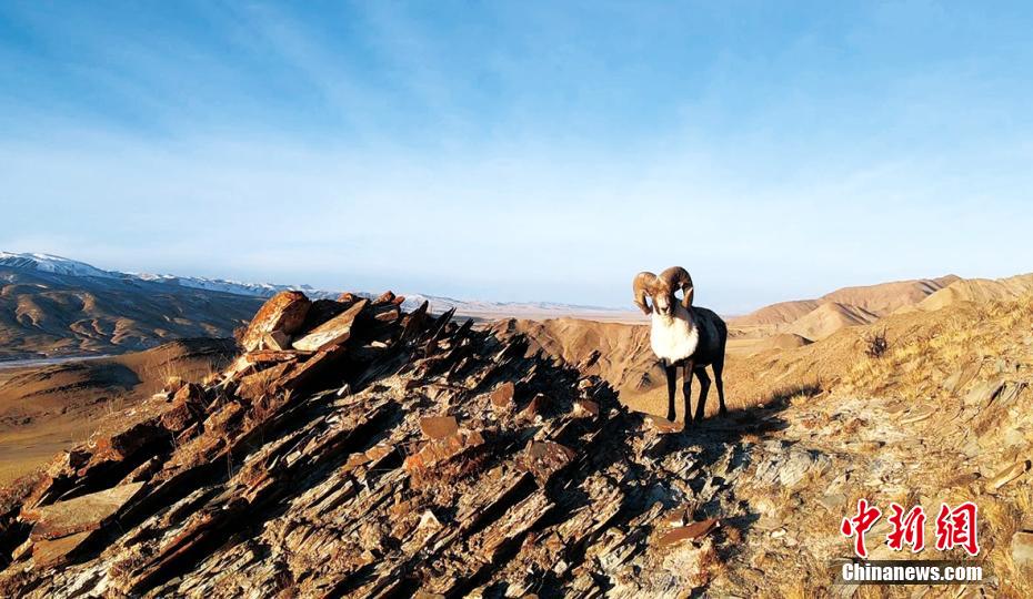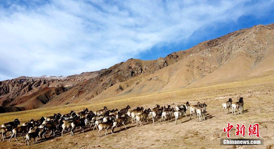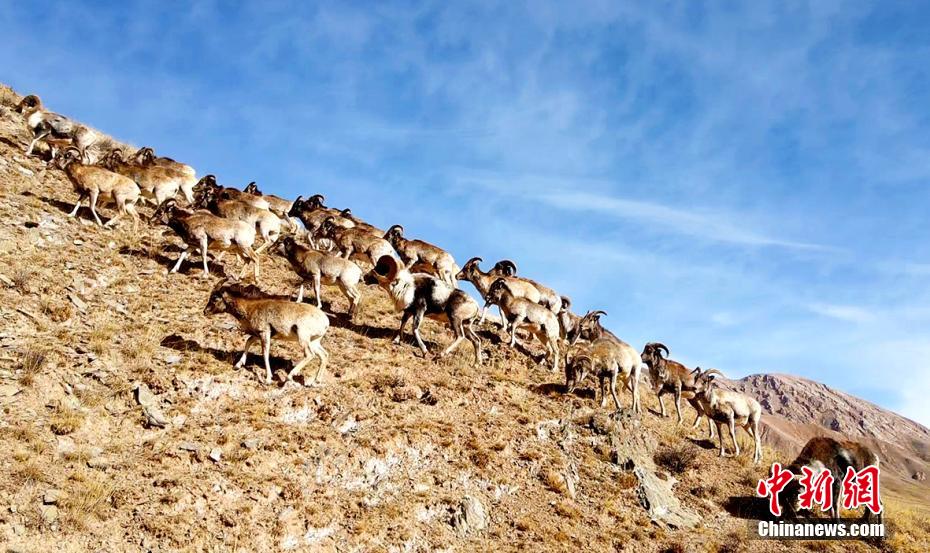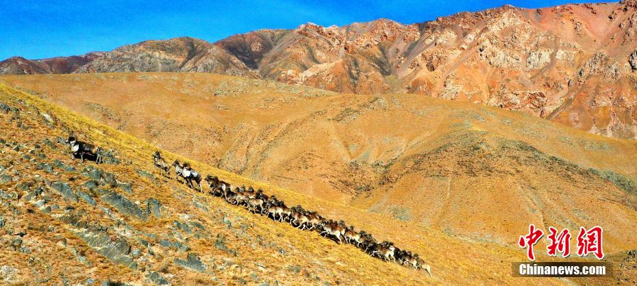 近日,攝影愛(ài)好者在地處柴達(dá)木盆地的青海省海西州都蘭縣香加鄉(xiāng)山區(qū)拍到成群盤(pán)羊。