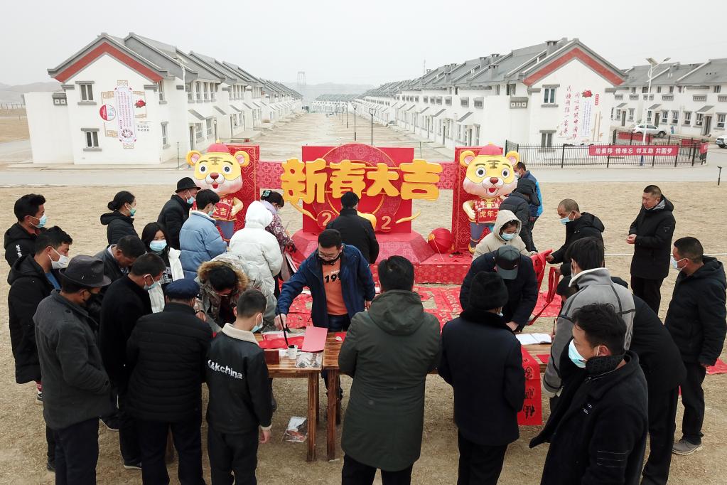 1月25日,在蘭州新區(qū)舟曲避險搬遷安置點,舟曲地質(zhì)災害避險搬遷第一臨時黨支部組織書法家給搬遷群眾送春聯(lián)。新華社記者 范培珅 攝