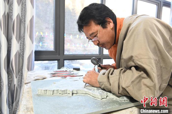 “叮當(dāng)”“叮當(dāng)”……清早,四川省阿壩州壤塘縣宗科鄉(xiāng)拉花創(chuàng)新工作室里傳出清脆敲擊聲。石板上,一幅藏傳佛教黃財(cái)神石刻像清晰呈現(xiàn)。非遺傳承人拉花俯著身子,正在進(jìn)行局部精刻:左手一把細(xì)長(zhǎng)的刻刀斜抵住石板上早已勾勒好的線條,右手扁平的鐵錘,有節(jié)奏地敲擊著刻刀尾部。