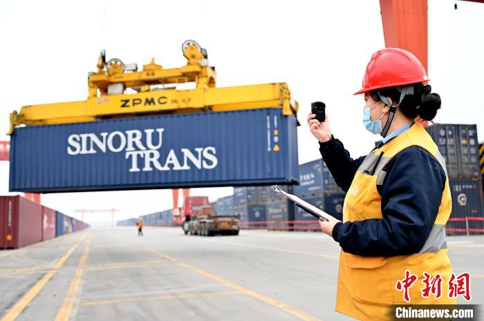 圖為周祖瑾對(duì)中歐班列集裝箱裝卸作業(yè)進(jìn)行安全監(jiān)控。鄧文鑫 攝