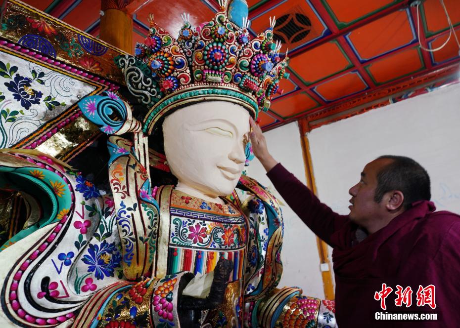 圖為塔爾寺藝僧為酥油花主佛做修飾。馬銘言 攝