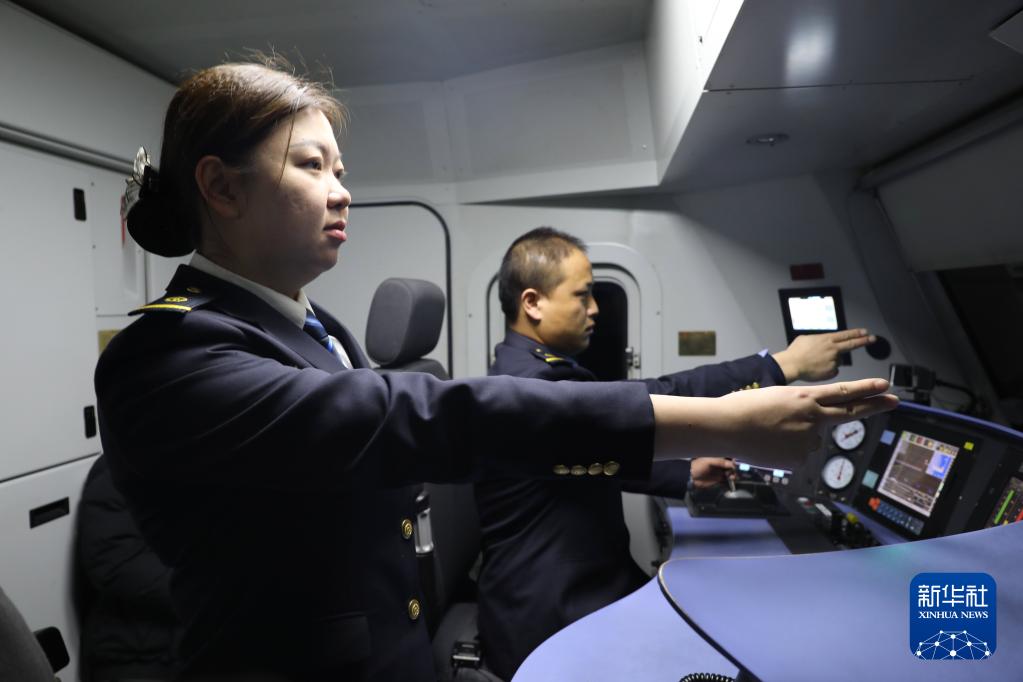張夢(mèng)晨和辛文忠在機(jī)車運(yùn)行中執(zhí)行呼喚應(yīng)答制度。張磊 攝