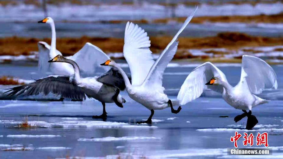 圖為一群天鵝在冰上“舞蹈”。 戴永峰 攝