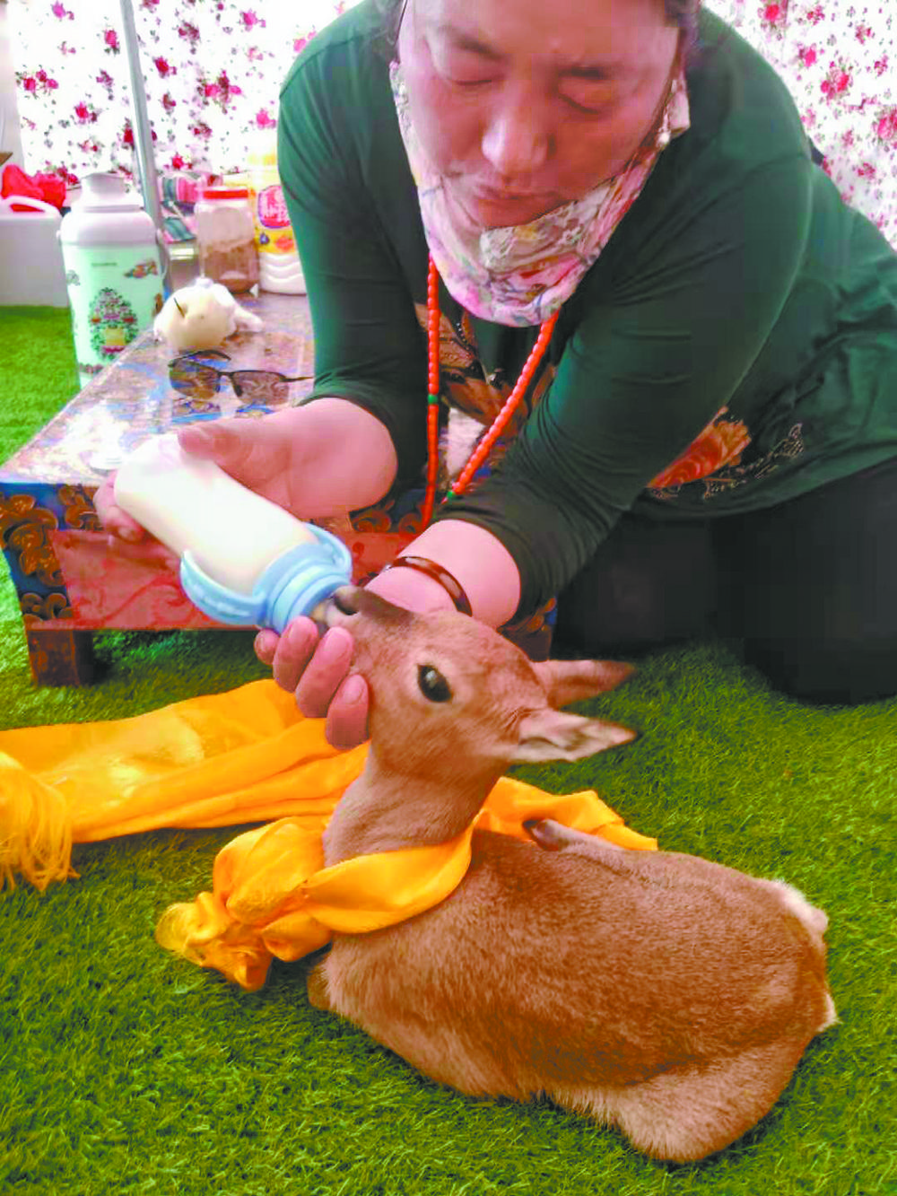 妻子扎西卓瑪始終沒有放棄喂養(yǎng)它,最初的3天,她每天都要花6個(gè)多小時(shí),或跪著或趴著,把奶嘴一次次伸進(jìn)“豆豆”口中,但又一次次被吐了出來。一家人整夜操心,輪流給它喂水喂奶,扎西卓瑪還在它的脖子上系了一條黃色的哈達(dá),當(dāng)做“幸運(yùn)結(jié)”,希望小原羚能活下來。