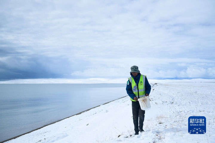 2021年10月,三江源國家公園黃河源園區(qū)生態(tài)管護(hù)員俄措在扎陵湖邊撿拾垃圾。新華社記者 張龍 攝