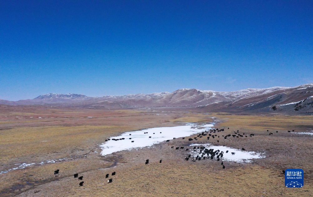 4月20日,在青海省玉樹藏族自治州曲麻萊縣,牦牛在草原上覓食(無人機(jī)照片)。新華社記者 柳澤興 攝