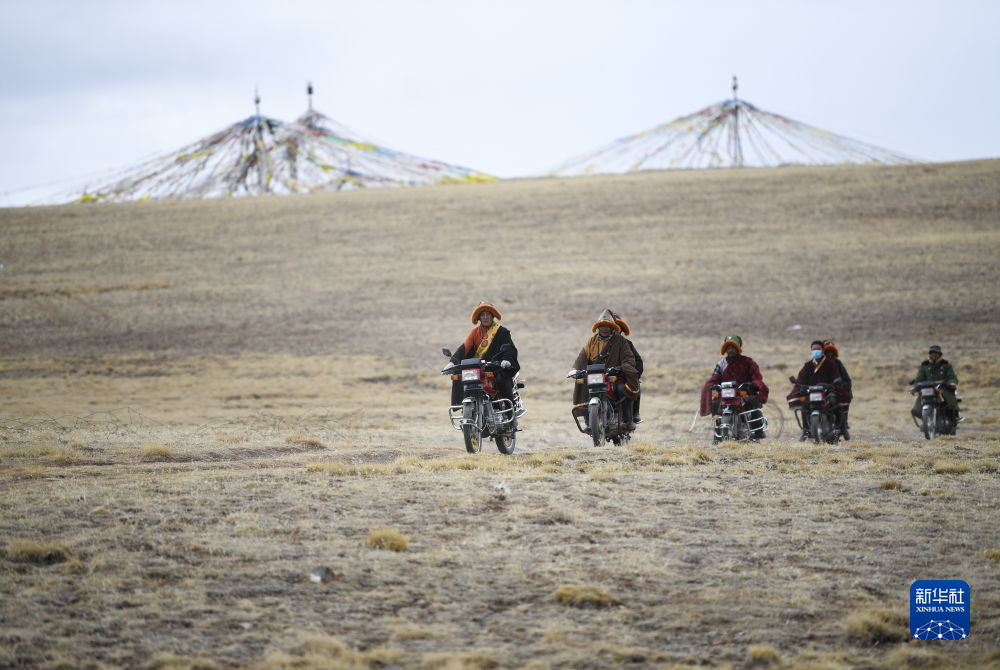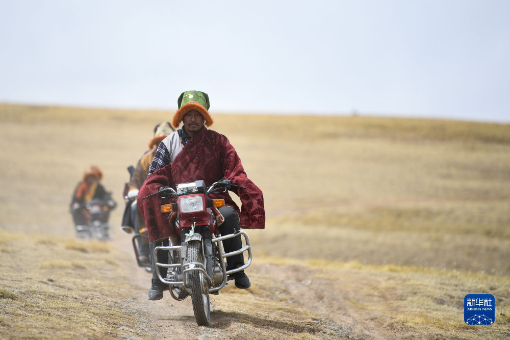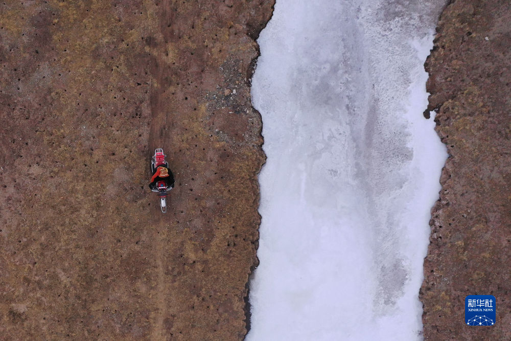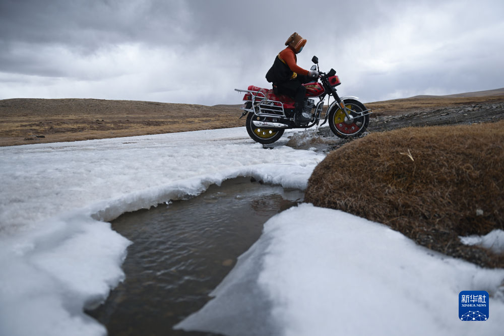 4月21日,在青海省玉樹(shù)藏族自治州曲麻萊縣麻多鄉(xiāng)約古宗列曲附近,生態(tài)管護(hù)員才仁扎西駕駛摩托車(chē)巡護(hù)。新華社記者 張龍 攝