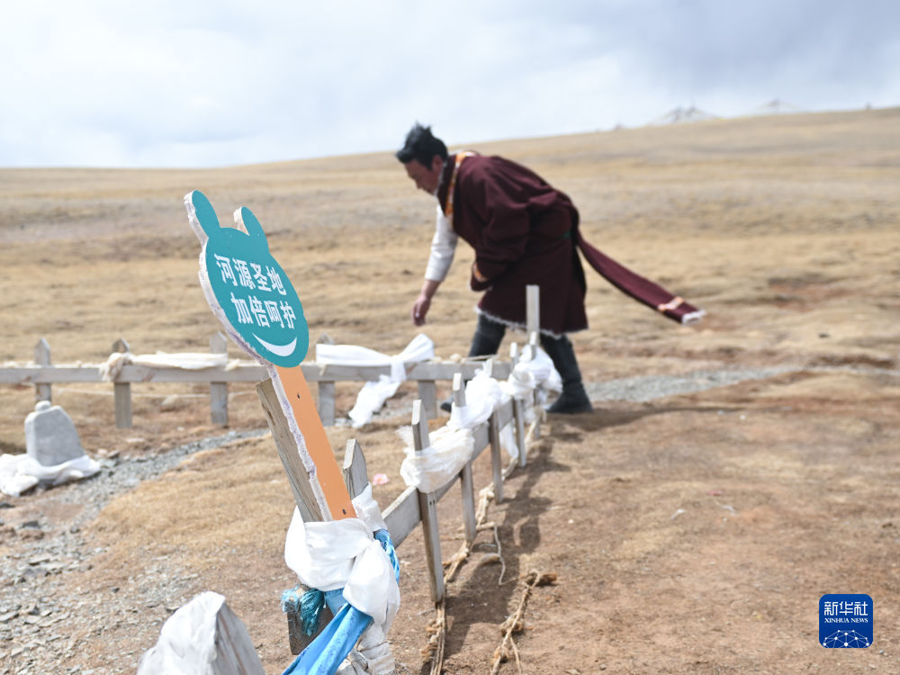 4月21日,在青海省玉樹(shù)藏族自治州曲麻萊縣麻多鄉(xiāng)約古宗列曲附近,生態(tài)管護(hù)員格桑東周在整理黃河源頭的柵欄。新華社記者 張龍 攝