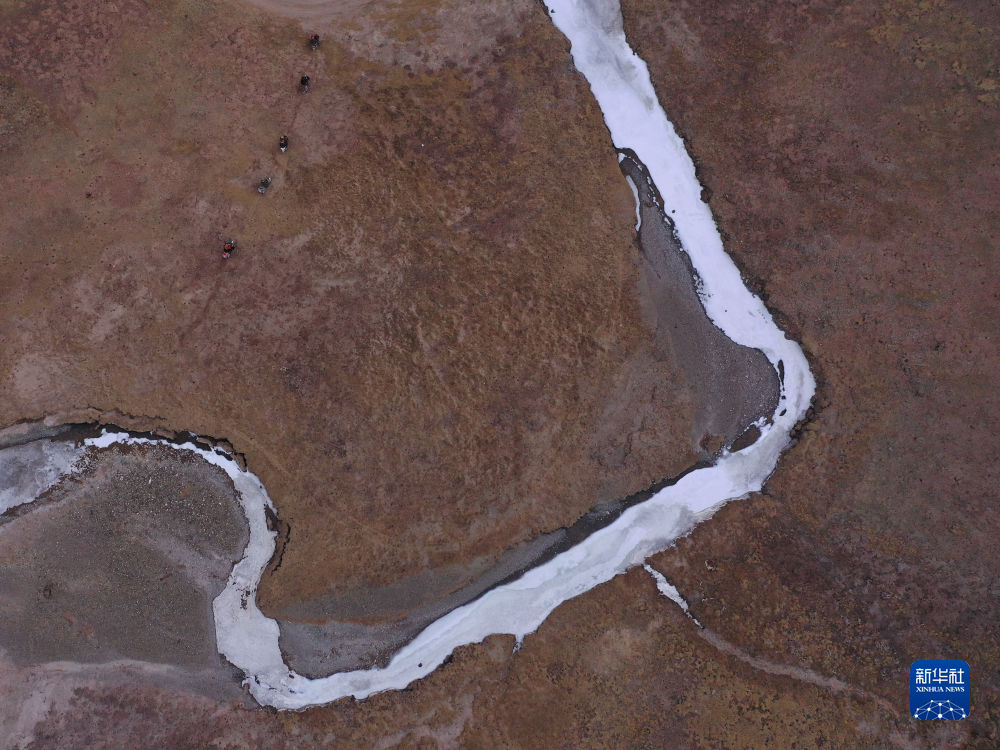 4月21日,在青海省玉樹(shù)藏族自治州曲麻萊縣麻多鄉(xiāng)約古宗列曲附近,生態(tài)管護(hù)員在巡護(hù)(無(wú)人機(jī)照片)。新華社記者 張龍 攝