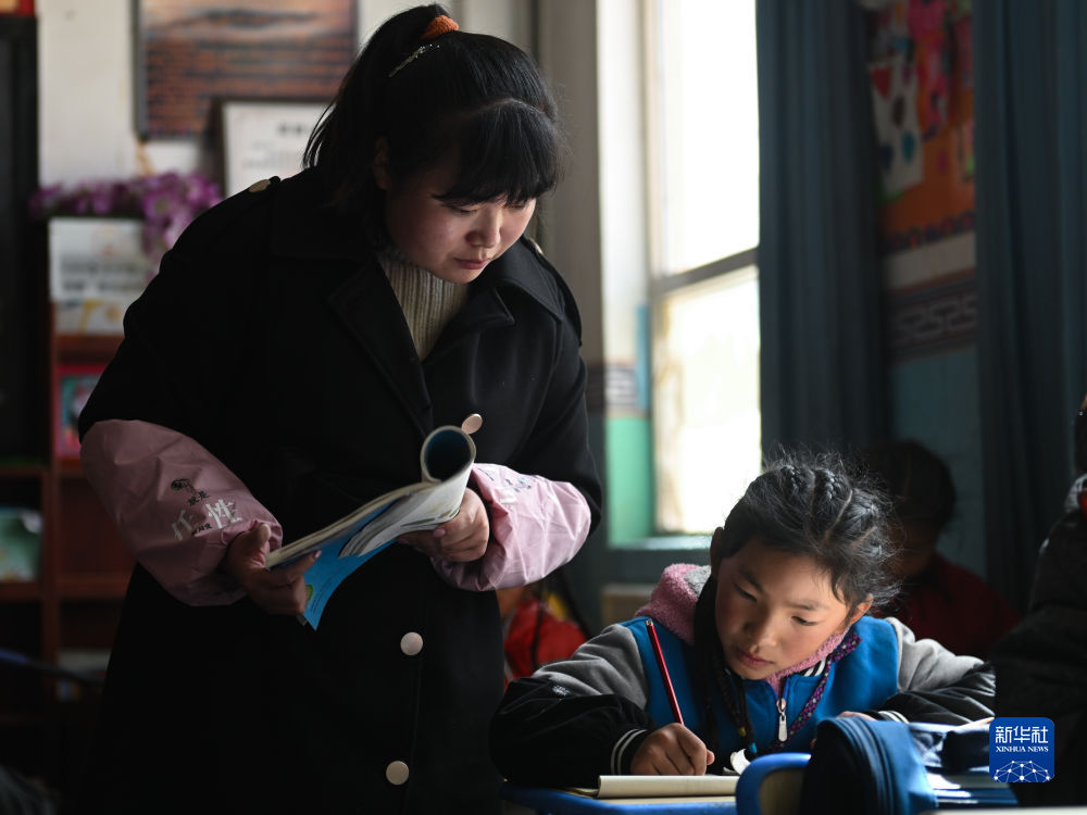 4月22日,青海省玉樹藏族自治州曲麻萊縣巴干鄉(xiāng)寄宿制小學的教師王芳(左)在指導學生學習。新華社記者 張龍 攝
