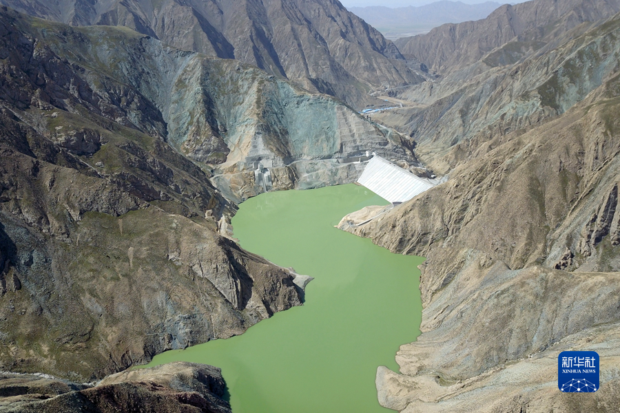 這是6月8日在青海省海西蒙古族藏族自治州德令哈市境內(nèi)拍攝的蓄集峽水庫大壩(無人機照片)。新華社記者 范培珅 攝