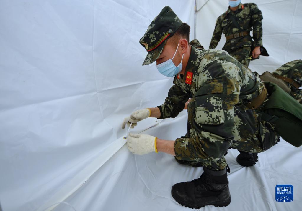 6月10日,在馬爾康市州醫(yī)院背后廣場安置點(diǎn)內(nèi),武警阿壩支隊隊員在搭建帳篷。新華社記者 劉坤 攝