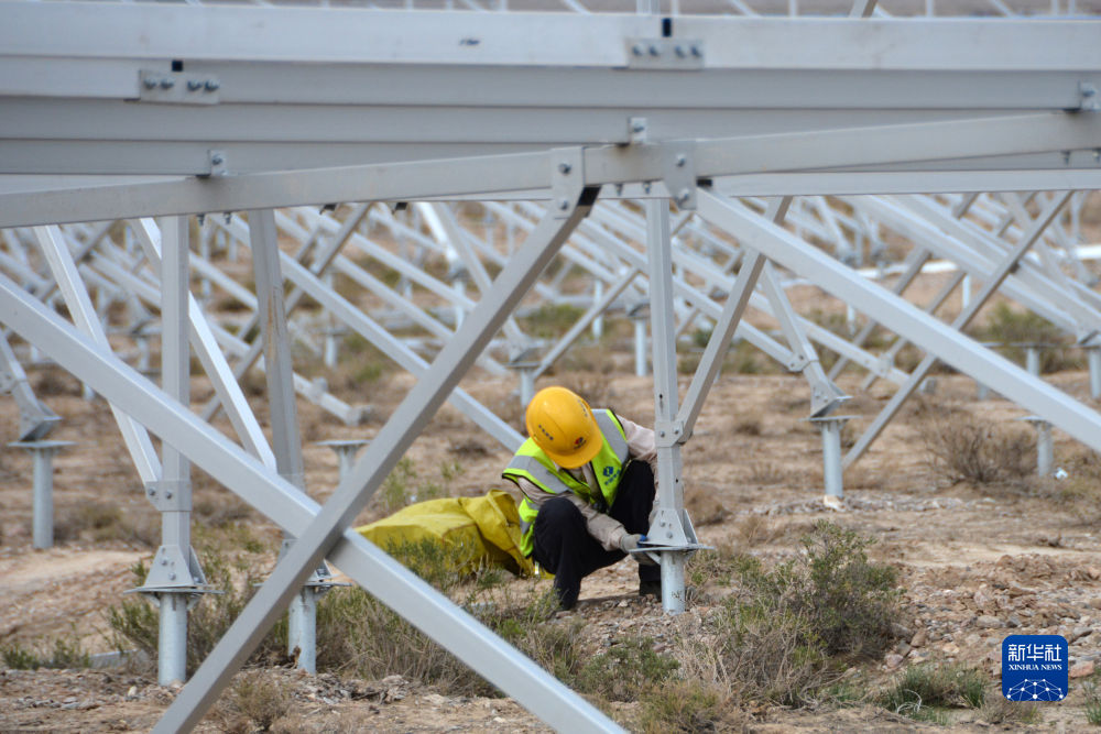 6月7日,在國(guó)家電投集團(tuán)黃河公司德令哈220萬(wàn)千瓦多能互補(bǔ)項(xiàng)目一期100萬(wàn)千瓦光伏項(xiàng)目建設(shè)現(xiàn)場(chǎng),工人在安裝光伏支架。新華社記者 王浡 攝