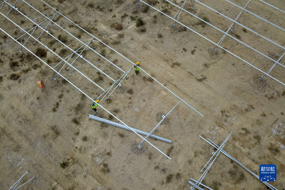 6月7日,在國(guó)家電投集團(tuán)黃河公司德令哈220萬(wàn)千瓦多能互補(bǔ)項(xiàng)目一期100萬(wàn)千瓦光伏項(xiàng)目建設(shè)現(xiàn)場(chǎng),工人安裝光伏支架(無(wú)人機(jī)照片)。新華社記者 范培珅 攝