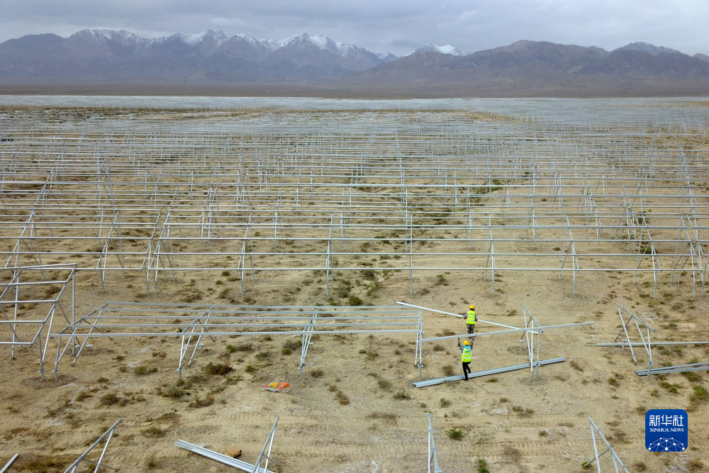 6月7日,在國(guó)家電投集團(tuán)黃河公司德令哈220萬(wàn)千瓦多能互補(bǔ)項(xiàng)目一期100萬(wàn)千瓦光伏項(xiàng)目建設(shè)現(xiàn)場(chǎng),工人安裝光伏支架。新華社記者 范培珅 攝