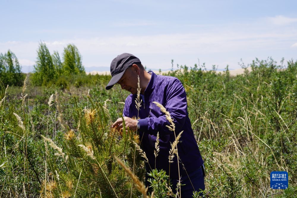 6月16日拍攝的馬文虎在克圖治沙點(diǎn)查看綠植長勢。新華社記者 李琳海 攝
