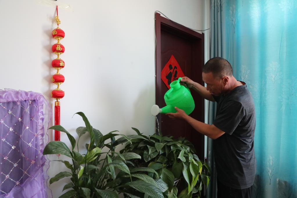 劉長海在新家里澆花。新華社記者王博攝