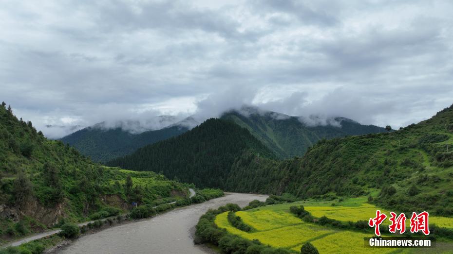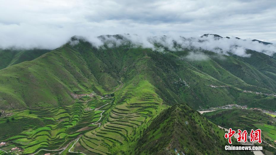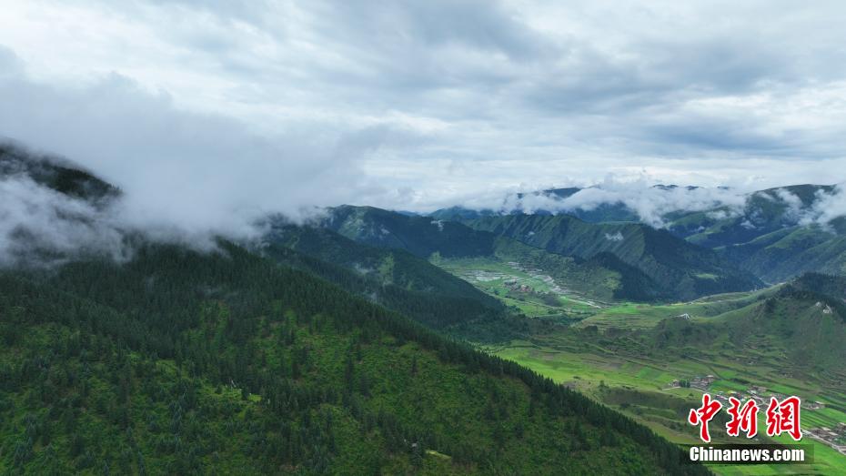 7月11日,一場降雨過后,云霧如潔白的哈達飄落在青海省果洛藏族自治州班瑪縣瑪可河國家森林公園山頭,與樹木、河流、梯田相互映襯,自然風景美如畫。
