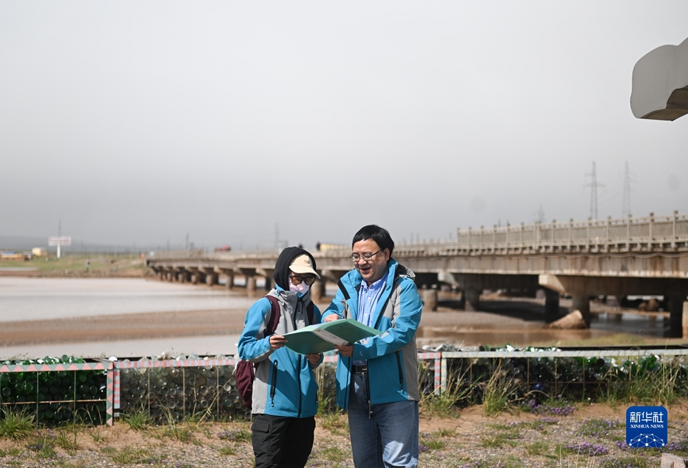 在長江源地區(qū),焦弘睿(左)與導(dǎo)師在查看江源地區(qū)的資料。新華社記者 張龍攝