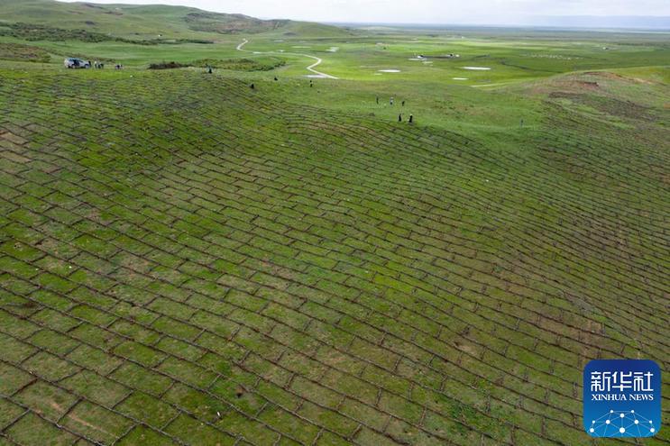 7月25日,在若爾蓋縣麥溪鄉(xiāng)黑河村,村民用高原柳編成沙障(無人機拍攝)。新華社記者 江宏景 攝