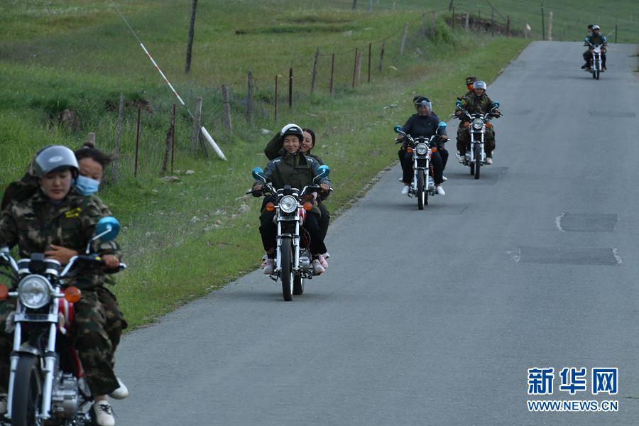 圖為代吉桑毛和隊員們準備騎摩托車出發(fā)。新華網(wǎng) 卡婭梅朵 攝