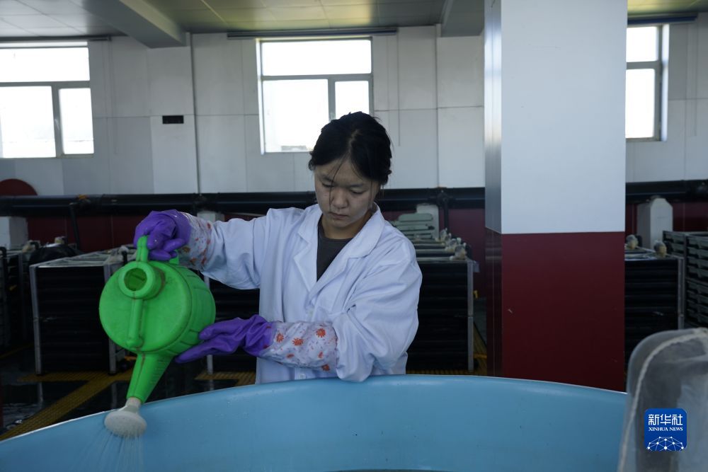 8月8日,青海湖裸鯉救護(hù)中心的工作人員為繁育車間里的湟魚(yú)喂食。新華社記者 陳杰 攝