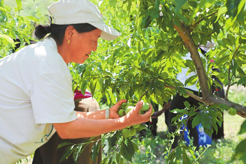 羅窩村青紅脆李種植基地中,村民正在摘李子。