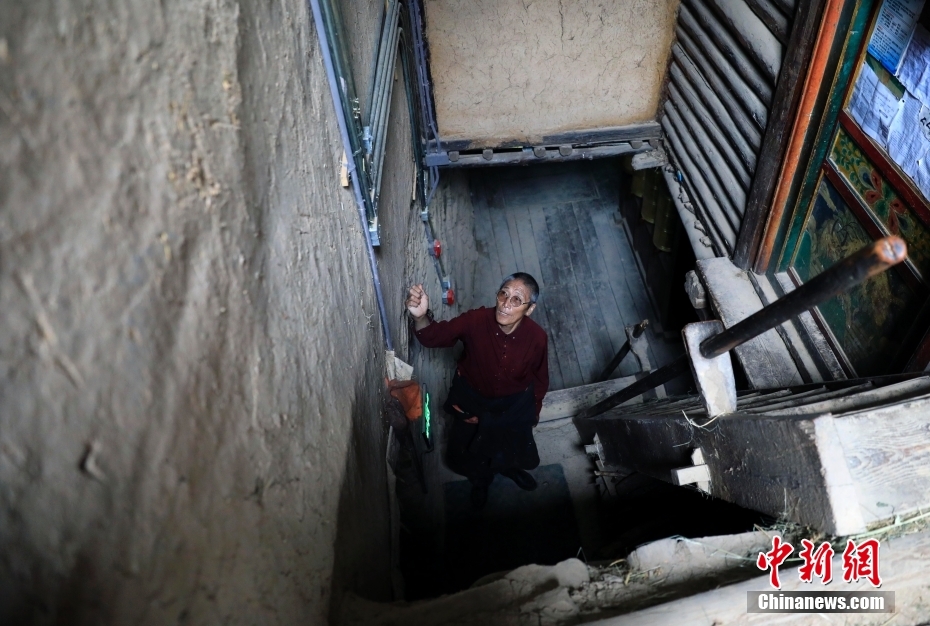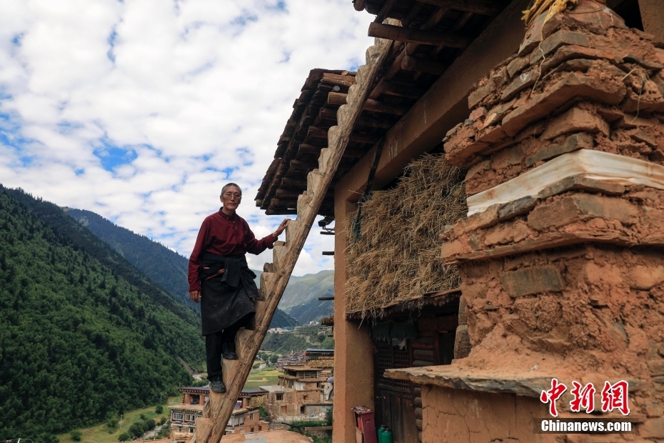 8月17日,日斯?jié)M巴碉房的主人洛吾王爾甲站在木梯上。日斯?jié)M巴碉房坐落于四川省阿壩藏族羌族自治州壤塘縣宗科鄉(xiāng)加斯?jié)M村石波寨,修建于元末明初,距今已有近700年的歷史。碉房共分九層,高25.6米,外型呈階梯狀,是一座保存完好的藏式傳統(tǒng)民居。2006年,日斯?jié)M巴碉房被列為全國重點文物保護單位。 中新社記者 王磊 攝