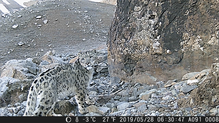 “我時(shí)常覺得,與其說是我們觀察雪豹,不如說是雪豹在觀察我們,它觀察我們,比我們觀察它要容易得多。”據(jù)王大軍講述,有一次,團(tuán)隊(duì)追蹤到一只雪豹的身影停留在山間,但遠(yuǎn)遠(yuǎn)望去,只有一條尾巴露在外面。通過攝影設(shè)備拉近畫面,才發(fā)現(xiàn)原來那只雪豹的雙眼也正在透過巖石的縫隙,觀察著他們。