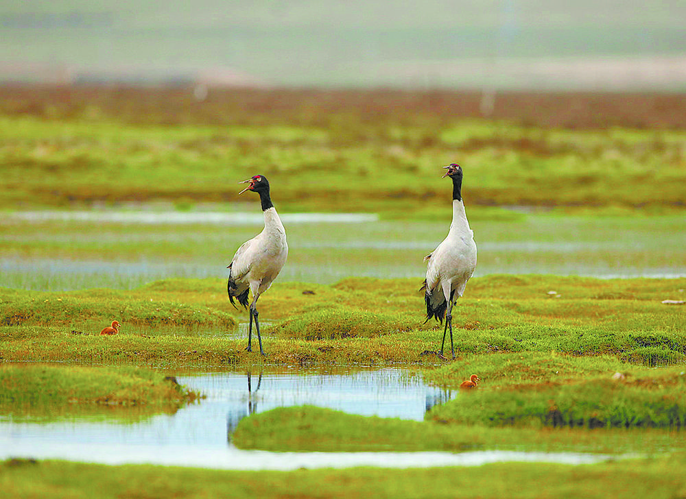 祁連山國家公園里黑頸鶴一家的幸福生活
