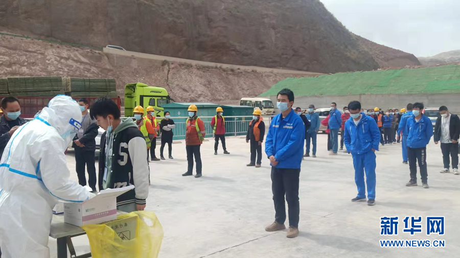 瑪爾擋水電站建設(shè)現(xiàn)場,施工人員排隊進行核酸檢測。新華網(wǎng) 劉小芳 攝