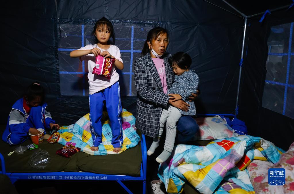 9月5日晚,在四川甘孜州瀘定縣磨西鎮(zhèn)的受災群眾臨時安置點,幾個家庭的孩子們在一個帳篷里吃飯、休息。新華社 沈伯韓 攝