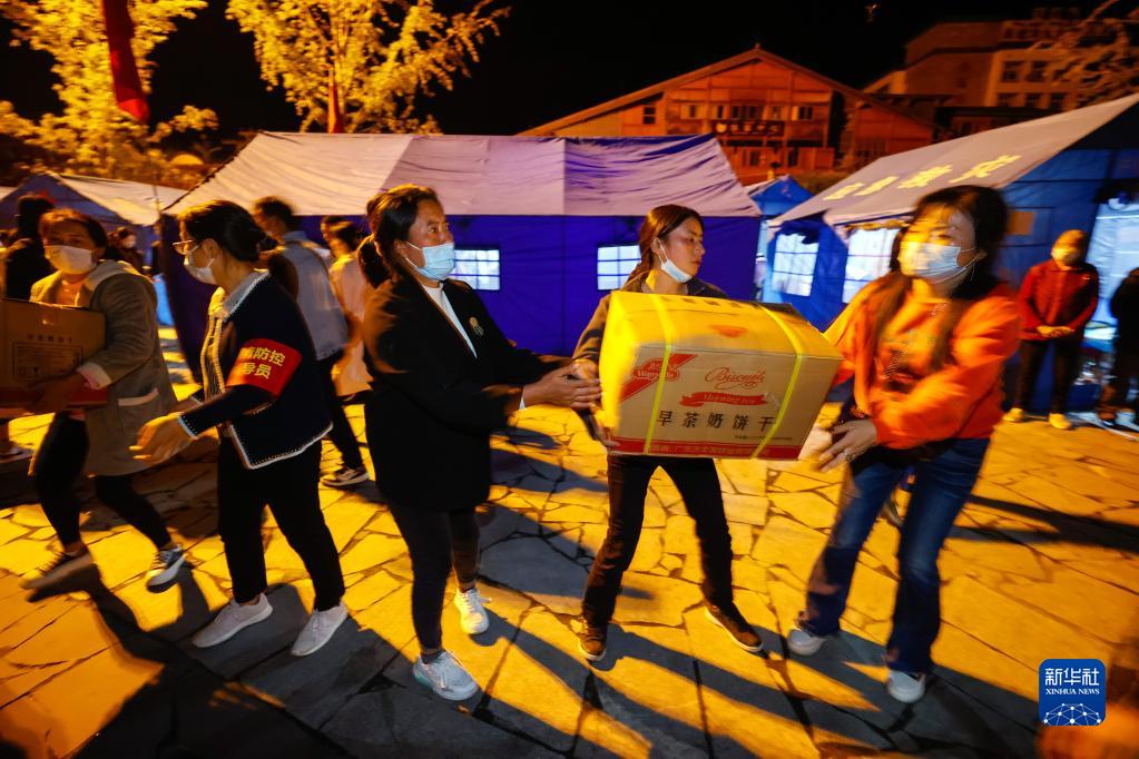 9月5日晚,在四川甘孜州瀘定縣磨西鎮(zhèn)的受災群眾臨時安置點,人們在傳遞救災物資。新華社 沈伯韓 攝