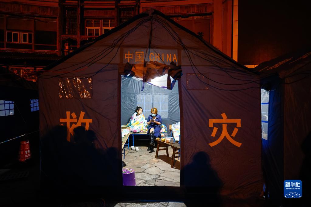 9月5日晚,在四川甘孜州瀘定縣磨西鎮(zhèn)的受災群眾臨時安置點,受災群眾在帳篷里。新華社 沈伯韓 攝