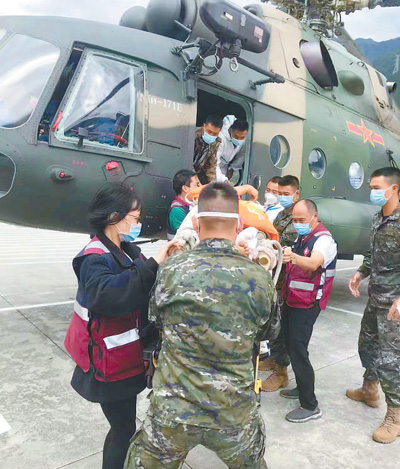 9月6日,在四川省瀘定縣瀘橋鎮(zhèn),四川省人民醫(yī)院赴瀘定醫(yī)療隊(duì)醫(yī)務(wù)人員正接診直升機(jī)轉(zhuǎn)運(yùn)出來的傷員。王明峰 蘭昌文 攝