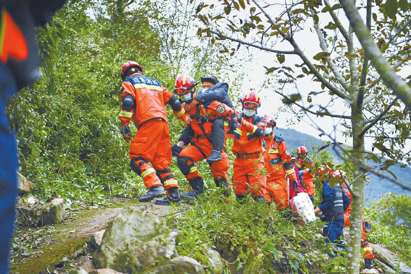 救援隊員協(xié)助紫雅場村最后一批村民下山,他們隨后將通過水路轉(zhuǎn)移至設(shè)在得妥鎮(zhèn)場鎮(zhèn)的受災群眾安置點。 四川日報全媒體記者 楊樹 攝