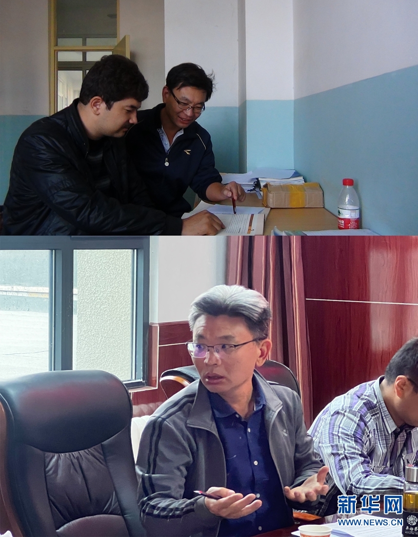 這是一張拼版照片:上圖為2014年6月23日,趙焱(右)與和田縣第二中學(xué)青年教師一起交流(新華網(wǎng)發(fā) 受訪對象供圖);下圖為2022年3月31日,趙焱(左)在玉樹州教育局參加玉樹州高三備考會。(新華網(wǎng)發(fā) 受訪對象供圖)
