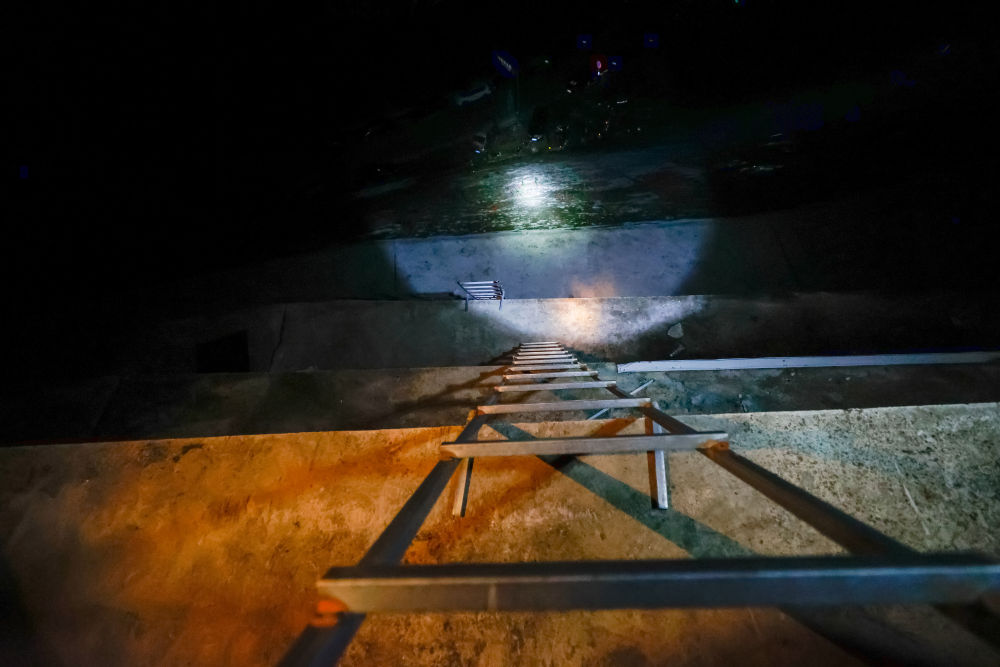 本以為沿著這條公路就可以走到得妥,轉(zhuǎn)過幾道彎,前面道路中斷完全無法通行,李祥帶我們到了真正可以下山的地方。這是一片分為好幾層的幾乎垂直的水泥邊坡,即便是應(yīng)急電筒的強(qiáng)光,也照不亮它的底。每層邊坡之間有鋼梯連接,我們要順著鋼梯爬下去,“山下會有車來接我們”,李祥淡定地說。