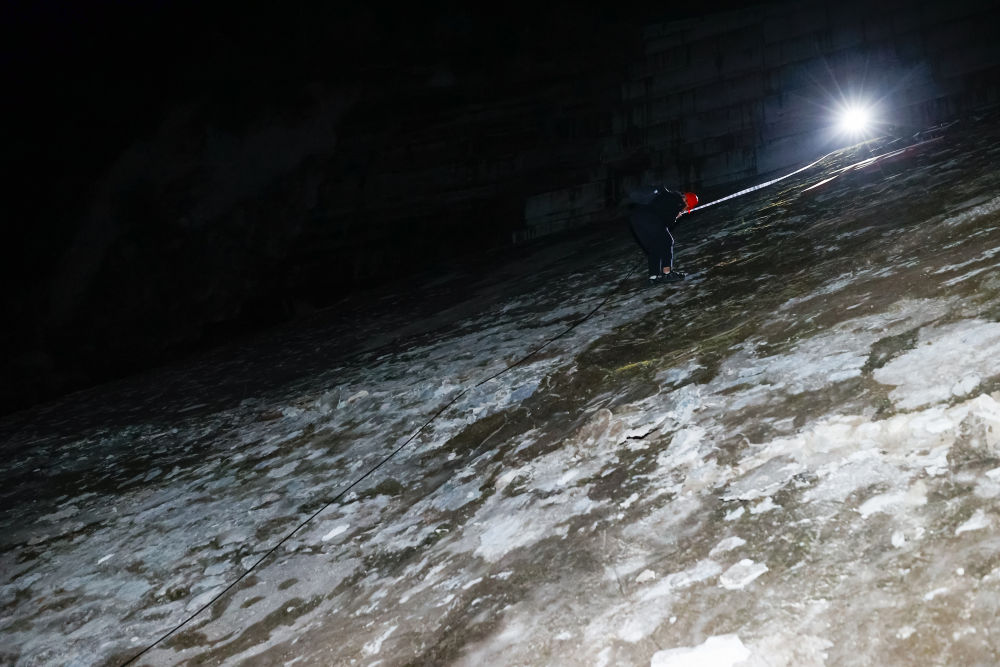 9月6日凌晨,新華社記者馮家順抓著繩索下山。