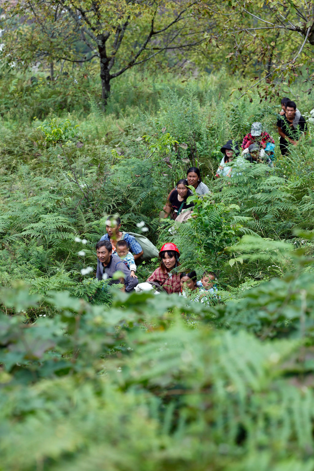 熟悉地形的村民在前帶路。其實毫無“路”可言,我和救援人員只能沿著依稀可辨的足跡向上攀爬。山高陡峻,時不時會遇到山體傾斜角度大于60度的路段,只能手腳并用才能上去。為了減輕負(fù)重,我把巧克力這樣的補給都放在了山下,只帶了一瓶水在身上。很快,滿頭大汗,汗水流入眼睛刺得生疼。抬頭望著遙遠(yuǎn)的需要翻越的山頭,對體力和耐性都是巨大考驗。一些救援人員因為工作需要,還背著很重的繩子,辛苦程度可見一斑。