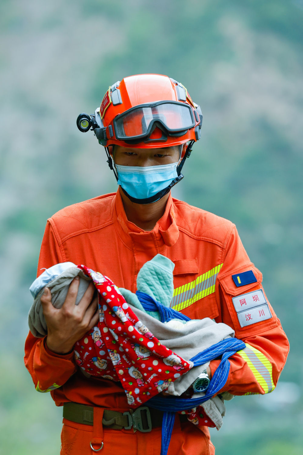 我一路小跑到消防員前面一段距離,拿起帶著長焦鏡頭的相機(jī),蹲下,拍攝,再向前跑一段,再蹲下,再拍攝。經(jīng)歷了一天差不多10個小時的徒步、拍攝,此時我的體力確實有些跟不上,為了保證能把這個場景拍好,只能多拍一些,不留遺憾。消防員沿著土路折了幾道彎才走到聯(lián)合村隧道口的大路,把嬰兒交給值守在那里的瀘定縣人民醫(yī)院的醫(yī)護(hù)人員。此時我才有時間和他簡單聊了聊。他叫張自立,來自阿壩森林消防支隊汶川大隊,2個月大的嬰兒來自重災(zāi)區(qū)灣東村。經(jīng)過包括新華社、人民日報、央視等媒體對這張照片的傳播,他第二天就成了大家口中的“汶川哥哥”。